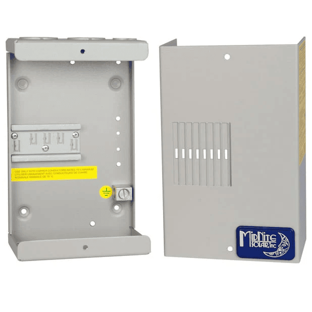 Boîtier en aluminium MidNite Solar Big Baby Box pour jusqu’à 4 disjoncteurs DIN 13 mm de large. Comprend une cosse de mise à la terre.